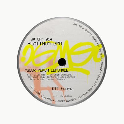 FLAVOR: Sour Peach Lemonade TERPENES: B-Caryophyllene, Limonene, a-Humulene SIZE: 10CT STRENGTH: 100MG THC (10MG/SERVING) Slip into warm weather and unwind with Off Hours Platinum GMO “Sour Peach Lemonade” Live Rosin gummies. These refreshing and relaxing gummies pair savory and floral Platinum GMO with bright, summery peach lemonade for the perfect chilled out high. SUGGESTED USE: Start with 1/2 of a gummy. Wait 1 full hour before increasing dose. INGREDIENTS: Organic Cane Sugar, Reverse Osmosis Water, Organic Tapioca Syrup, Organic Fruit Juice from Concentrate, Fruit Pectin, Organic Fruit Flavoring, Natural Food Coloring, MCT Oil, Cannabis Extract, Malic Acid, Sunflower Lecithin