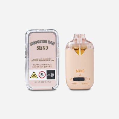 The Smoothie Bar: Blend 2.0 is a dual-tank, postless, ceramic-coil vaporizer that delivers a new way to explore two premium cannabis concentrates on the go. Savor each strain's unique character individually or BLEND to discover a carefully curated flavor synergy. Unlike traditional single-strain vapes, the dual-tank design highlights the interplay between individual live resin profiles, while delivering a powerful, satisfying, Papaya x Lemonade Papaya — An indica-dominant hybrid (Citral #13 × Ice #2) with lush tropical flavors of ripe mango and papaya accented by subtle spice. It delivers a calm, creative uplift that melts into soothing full-body relaxation—perfect for easing tension, stress, and promoting peaceful unwinding. Lemonade — A sativa-leaning hybrid known for its crisp lemon zest flavor and smooth, uplifting effects. Bursting with bright citrus and subtle herbal notes, it delivers a refreshing, energetic buzz that enhances mood, focus, and creativity—perfect for daytime clarity and social vibe and smooth experience. The Blend 2.0 device is designed with a tactile switch that controls the BLEND function and an intuitive screen featuring a battery power percent level with arrows that indicate the selected strain. For every Blend 2.0 produced, Smoothie Bar draws from the diversity of LA cannabis culture, combining technological innovation and deep-rooted industry experience to showcase the absolute best strain combinations