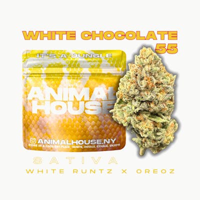 "White Chocolate 55 is a Sativa Strain derived from a cross of White Runtz and Oreoz. These Crystalized buds have a beautiful frost to them with a nice nutty and creamy nose. The smoke is smooth and natural with a hint of pine in addtion to the nutty and creamy nose smell. This allwos for a nice energizing boost for the consumer. This strain is perfect for a social setting or if you needed to get some work done and wanted to stay busy. Animal House ""Sunlight Assisted Indoor Flower"" is grown in the Hudson Valley on a solar powered independent farm by legacy growers with decades of experience growing under lights. We hand-trim and hand-select every bud that goes into each package to ensure customer satisfaction."