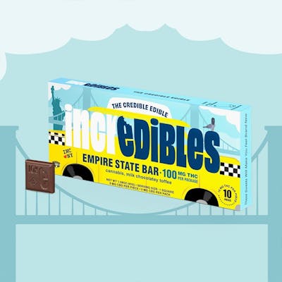 These sweets will make you feel brand new. Get into that N.Y. state of mind with a New York classic. Buttery toffee and pure, milk chocolatey joy. Made with 100% pure cannabis oil in a perfectly blended mixture to ensure accurate dosing and consistency. Perfect for exploring the Empire State. -- Featuring a precision-dosed confection collection with yummy flavors, delicious effects and FDA-approved ingredients, you can trust incredibles to be the credible edible. -- Potential effects: Promotes emotional well-being -- Serving size: Standard serving is a single square (10mg THC per piece). Bar contains 100mg THC molded into 10 equal segments. -- Onset & duration: Onset may take up to 2 hours. Duration can last up to 3+ hours. Effects vary by individual. Estimates are based on a standard serving. Contents: Made with pure THC oil and evenly blended for consistency. -- Allergens: Milk, soy, almonds. Made in a facility that processes tree nuts, peanuts, milk, soy, eggs, coconut and wheat. -- Ingredients: Milk and dark confectionery coating, toffee bits, palm kernel oil, cannabis extract -- Storage: Keep in original sealed container between 60°F - 80°F. Avoid conditions of high humidity and temperature. Keep out of direct light and do not store in hot car. -- Net Weight: 1.58oz (45g)