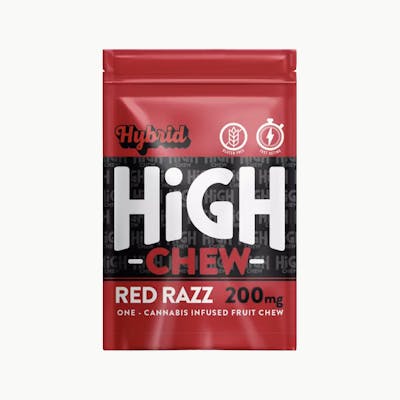 High Chew – Red Razz (1-piece 200mg Fast-Acting Hybrid Gummy) Bold, berry, and built to blast off. High Chew’s Red Razz gummy delivers 200mg of fast-acting hybrid THC in one mouthwatering bite. - Powered by Little Tree