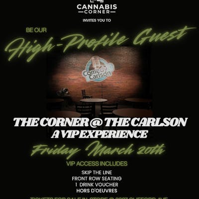 The Cannabis Corner invites you to be our HIGH-profile guest! The Corner @ The Carlson - A VIP Experience VIP Access Includes: Skip the Line Front-row Seat 1 Drink Voucher Hors D’Oeuvres Tickets for sale in-store @ Cannabis Corner 2227 Clifford Ave. Rochester, NY, 14609 (585) 576-4706
