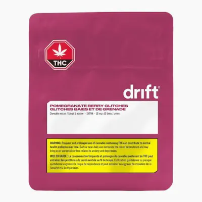 Drift Pomegranate Berry Glitch is a single unit of high-potency, fruit-flavoured chewable extract infused with 10mg of THC and delicious, sweet-tart flavours of pomegranate and berry. Thanks to their state-of-the-art emulsification process, you can enjoy with very minimal, if any, cannabis taste or smell.