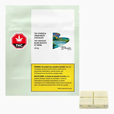 Bhang® THC Cookies and Cream White Chocolate pairs gourmet white chocolate and 10mg of THC, scored into four pieces. It has a cannabis-free flavour of white chocolate and crunchy cookie bits.