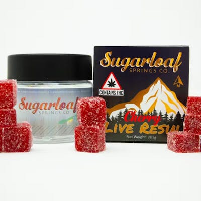 100mg Per Jar / 10mg Per Serving Sugarloaf Springs Co Live Resin Gummies Strain Specific (S/H/I) [See Budtender for Batch Details] These gummies are made using high-quality live resin extract, which means they retain all of the natural terpenes and cannabinoids found in the cannabis plant. Live resin has a more complex flavor profile and a more balanced effect than distillate, providing users with an experience that is closer to consuming specific strains.