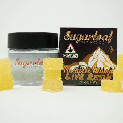 100mg Per Jar / 10mg Per Serving Sugarloaf Springs Co Live Resin Gummies Strain Specific (S/H/I) [See Budtender for Batch Details] These gummies are made using high-quality live resin extract, which means they retain all of the natural terpenes and cannabinoids found in the cannabis plant. Live resin has a more complex flavor profile and a more balanced effect than distillate, providing users with an experience that is closer to consuming specific strains.