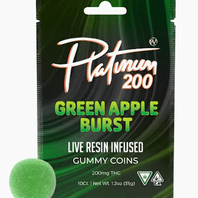 Platinum gummy coins are packaged 10 pieces in each bag at 100mg THC per bag. With a variety of bold flavors to choose from, there’s a flavor for everyone. Each one contains fruity flavors that will keep you coming back for more. The gummy coins are discreet and easy to use. Pucker up. This green apple gummy is sour upfront with a candy-sweet finish that bursts with every chew. Add in the smooth potency of live resin and you’ve got yourself a crisp, crunchy ride to the top shelf.