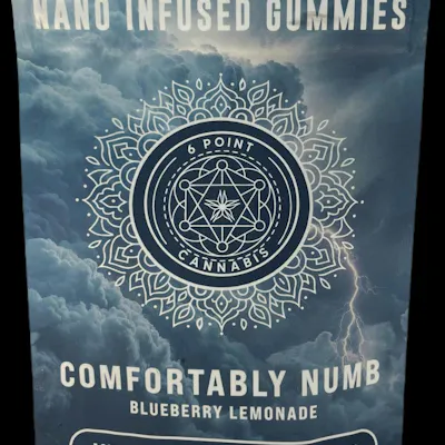 6 Point Cannabis – Blueberry Lemonade Nano-Infused Gummies (10pk) deliver a fast-acting, full-spectrum edible experience designed for consumers seeking deep relaxation with a smooth, controlled onset. Powered by nano-emulsified THC, these gummies provide quicker absorption and more predictable effects compared to traditional edibles.The flavor profile is bright yet balanced, combining sweet blueberry with tart lemonade citrus for a refreshing, slightly tangy finish. The result is a clean, fruit-forward taste with just enough acidity to keep it from being overly sweet.Formulated for “Comfortably Numb” effects, these gummies are geared toward a deeply calming, body-forward experience. Expect a gentle euphoric onset that transitions into a soothing, tension-melting physical relaxation, making them ideal for unwinding, evening use, or dialing down after a long day.Thanks to nano-infusion, onset is typically faster and more consistent, allowing for better control over your dosing and experience.Product Highlights:10-pack nano-infused gummiesFast-acting, consistent onset“Comfortably Numb” effect profile (deep relaxation, body-heavy calm)Blueberry lemonade flavor with sweet-tart balancePrecisely dosed for controlled useEffects: Relaxing, calming, body-heavy, soothingFlavor & Taste: Blueberry, lemonade, sweet, tart citrus