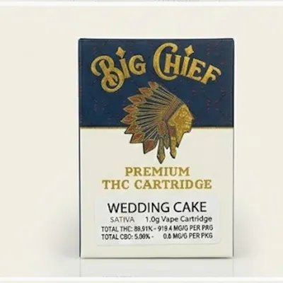 Big Chief – Wedding Cake1g Vape Cartridge | Indica-Dominant HybridIndulge in rich dessert flavor with Big Chief Wedding Cake 1g Vape Cartridge, an indica-dominant hybrid known for its sweet, creamy profile and deeply relaxing effects. Crafted for smooth, consistent vapor production, this cartridge delivers bold terpene flavor with reliable potency in every draw.Wedding Cake features a decadent flavor profile of sweet vanilla frosting, baked cake batter, and subtle earthy pepper, finished with a light gassy undertone. Each inhale offers smooth vapor and a satisfying dessert-like finish.The effects are euphoric and calming, beginning with a happy cerebral lift before settling into full-body relaxation. Ideal for evening sessions, stress relief, or winding down while maintaining a pleasant, uplifted mood.Designed for compatibility with standard 510-thread batteries, this 1g cartridge provides convenient, discreet use and consistent performance.