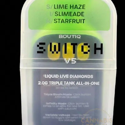 Boutiq – Lime Haze / Slimeade / Starfruit – Triple Tank Switch – 2g Liquid Diamonds Disposable (Sativa-Indica-Hybrid)Get the best of every world with the Boutiq Triple Tank Switch 2g Liquid Diamonds Disposable, featuring a dynamic three-strain lineup: Lime Haze, Slimeade, and Starfruit. With a Sativa-Indica-Hybrid rotation, this device gives you complete control over your session—whether you want an energizing lift, mellow body relaxation, or balanced all-around vibes.Infused with high-potency liquid diamonds, each tank delivers smooth, terpene-rich vapor and bold, true-to-strain flavor. The built-in Triple Tank Switch technology allows you to flip between strains instantly, offering versatility without the need for multiple devices.
