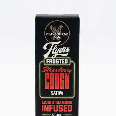 Claybourne Co – Frosted Flyer's – Strawberry Cough – Diamond Infused Pre-Roll 5pk (2.5g) | SativaClaybourne Co – Frosted Flyer's Strawberry Cough Diamond Infused Pre-Roll 5pk (2.5g) delivers a high-potency, terpene-rich smoking experience built for experienced consumers who want maximum strength with bold, fruit-forward flavor. Each pre-roll is infused with THC diamonds, elevating cannabinoid content and intensifying the overall session.Strawberry Cough is a classic sativa strain known for its sweet, berry-driven profile, blending ripe strawberry, light citrus, and subtle herbal spice. The diamond infusion enhances both potency and flavor, producing a smooth yet powerful smoke with a sweet inhale and a clean, slightly peppered exhale.The effects are fast-hitting and cerebral, delivering a strong euphoric lift that boosts mood, focus, and creative energy. The added potency from diamond infusion provides a more intense and longer-lasting experience, ideal for seasoned smokers.The 5-pack format offers consistent, ready-to-use pre-rolls that burn evenly and maintain flavor from start to finish—perfect for multiple sessions or sharing.Product Highlights:5-pack diamond-infused pre-rolls (2.5g total)Sativa strain: Strawberry CoughEnhanced potency with THC diamond infusionSweet, berry-forward terpene profileSmooth, even-burning rollsEffects: Euphoric, energetic, focused, long-lastingFlavor & Aroma: Strawberry, sweet berry, citrus, herbal, spice