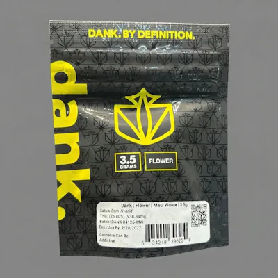 Dank – Maui Wowie Sativa Indoor Flower – 3.5GTransport yourself to tropical paradise with Dank Maui Wowie Sativa Indoor Flower, a vibrant 3.5-gram pack of premium indoor-grown buds bursting with classic island flavor. Known for its uplifting and energetic effects, this sativa strain delivers a smooth, sweet pineapple aroma with citrus and tropical fruit undertones that awaken your senses and spark creativity.Carefully cultivated indoors to maximize potency and terpene profile, Dank’s Maui Wowie offers clean, clear-headed energy perfect for daytime use, socializing, or creative pursuits.Key Features: • Strain: Maui Wowie (Sativa) – energizing, uplifting, and focused • Quantity: 3.5 grams premium indoor flower • Flavor Profile: Sweet pineapple, citrus, and tropical fruit notes • Effect Profile: Euphoric, creative, and mood-boosting – ideal for daytime use • Cultivation: Indoor-grown for superior quality and consistent effectsExperience the tropical vibes and bright energy of Dank Maui Wowie Sativa Indoor Flower — a perfect choice for those seeking a flavorful, potent sativa with clear and uplifting effects.