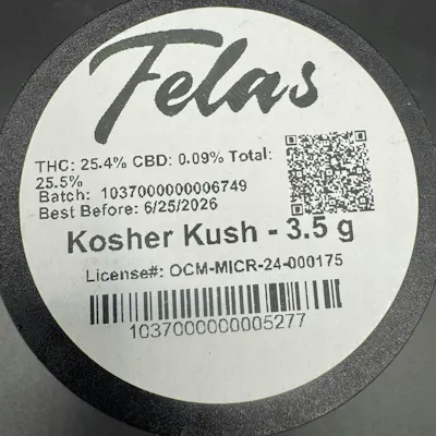 Felas Kosher Kush – 3.5G Premium Indoor Flower | Indica | 25.4% THCIndulge in the legendary power of Felas Kosher Kush, a premium indica strain known for its deeply relaxing effects and rich, full-bodied flavor. This 3.5-gram (1/8 oz) indoor-grown flower delivers high potency and exceptional quality, ideal for those seeking a heavy, soothing high.With a strong THC content of 25.4% and CBD at 0.09%, Felas Kosher Kush offers a deeply calming experience—perfect for stress relief, restful sleep, and full-body comfort. The effects are sedative, euphoric, and long-lasting, making it a go-to choice for nighttime use or moments of deep relaxation.Expect a pungent, earthy aroma layered with notes of pine and citrus, delivering a smooth, flavorful smoke that lives up to its award-winning reputation.Key Features: • Classic indica strain • 3.5G (eighth) of premium indoor-grown flower • High potency: 25.4% THC • 0.09% CBD • Deeply relaxing, sedating, and mood-enhancing effects • Flavor profile: pungent earth, pine, and citrus • Ideal for evening use, sleep support, and stress reliefExperience Felas Kosher Kush today and unwind with one of the most iconic indicas in cannabis history—cultivated to perfection and built to relax.