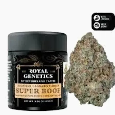 Royal Genetics – Superboof (Indoor) – 3.5gStep up your smoke with Royal Genetics Superboof (Indoor), a 3.5g premium indoor-grown flower prized for its dense, resin-rich buds, vibrant aroma, and potent effects. Grown in controlled indoor conditions to maximize trichome production and terpene expression, Superboof delivers a bold and memorable experience for both flavor chasers and effect seekers.Superboof brings a complex terpene profile featuring sweet berry and tropical fruit notes, layered with earthy spice and subtle herbal undertones that create a rich, aromatic smoke. On the palate, expect fruit-forward sweetness balanced by smooth, earthy depth, resulting in a flavorful, smooth draw from start to finish.This hybrid strain offers well-rounded effects, starting with a focused cerebral uplift that enhances mood and creativity, before settling into gentle body relaxation that eases tension without heavy sedation. Whether you’re gearing up for a creative session or winding down after a busy day, Superboof delivers a balanced, enjoyable experience.Highlights:Strain: Superboof (Hybrid – Indoor)3.5g premium indoor flowerTerpene profile: berry, tropical fruit, earthy spiceBalanced uplifting cerebral effects and gentle body calmDense, trichome-rich buds with smooth flavor and aromaIdeal for daytime or evening session versatilityRoyal Genetics Superboof: juicy, flavorful aroma and balanced hybrid effects in every premium indoor gram.