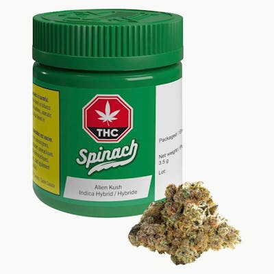 We've made first contact. Spinach Alien Kush has started its invasion and you're not gonna want to miss it. With pine, citrus and earthy aromas, this alien embodies all the beautiful things here on earth. But its powered-up THC potency will remind you that it is out-of-this world and travelling at full force. Inspired by a strain with an Alien Dawg and Purple Kush lineage, enjoy frosty white trichomes buds, imitating the wonders of the night sky and the great beyond. Will you join us on this trip into space?