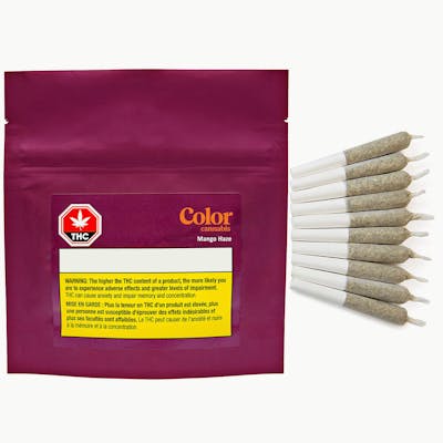 Color Mango Haze pre-rolls are perfectly packed with gently milled flower, not trim or shake, to ensure each pre-roll contains the freshest and most flavourful cannabis possible. A balanced CBD/THC cultivar that is rich in flavour, its bountiful terpenes of p-cymene, myrcene, pinene and beta-caryophyllene give this cultivar its signature mango scent. Mango Haze is a sativa-dominant hybrid that produces a mild THC potency potential from the genetic cross between Northern Lights, Skunk and Haze. Our Color Cannabis pre-rolls use flower that has been harvested with care, dried naturally, gently milled and then packed into the perfect size. Each unit comes with single session size pre-roll, weighing 0.35g each. Now available in a convenient 10-pack.