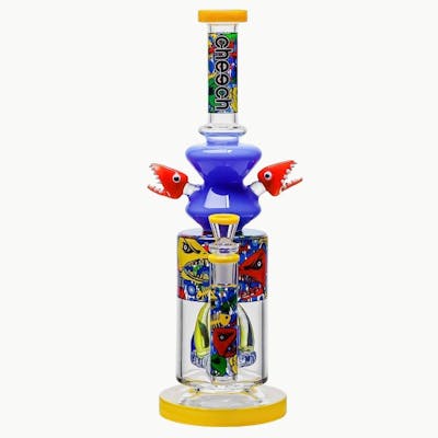 Featuring sharp-toothed 3D shark arms, vibrant monster graphics, and bold primary color accents, this bong is as fierce as it is functional. The detailed central perc delivers smooth, filtered hits while the wide base ensures stability. A true statement piece for collectors who love personality-packed glass.