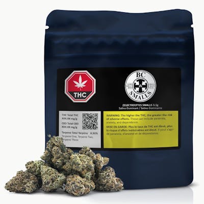Zelectrolytes flips the switch with a Sativa-Dominant spark straight out of Orange-Ade × The Original Z. This cut looks like it’s been plugged into neon, showing off deep green and purple colouring wrapped in a glittering coat of trichomes. It bursts with grape and berry sweetness, balanced by earthy notes that keep it grounded; typical of true exotics. Packed into a 3.5g bag under the BC Smalls banner, Zelectrolytes brings flavour, juice, and sweet, invigorating vibes.