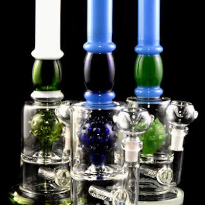 Medium stemless glass on glass straight shooter water pipe with multicolored glass accents, inline percolator, and virus percolator. Colors will vary. 14.5mm female connection.