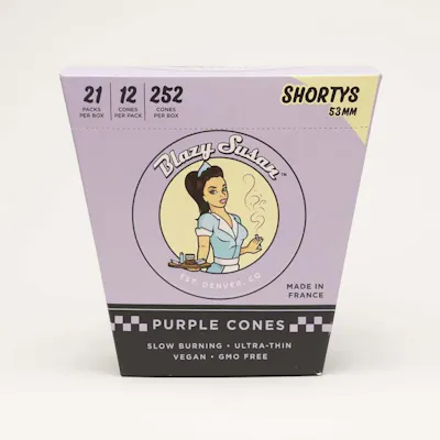 Shorty Purple Pre Rolled Cones | Take a little smoke break with the Shorty Cones from Blazy Susan! These mini cones are 53mm – around half the size of our regular cones. Whether you just need a few hits to get your head straight, you want to try out a couple different strains individually, or want to give everyone their own personal joint at the party, the Shortys are just what you need! Take one on your next hike or walk around the park and treat yourself right.