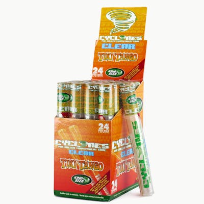 The Cyclones Pre-Rolled Clear Cigar Tube – Tiki Tango King Size are a totally new concept in smoking – super slow burning and flavorful. They’re a cone made from natural cotton cellulose, glycerin and water. They burn much slower than a cigarette paper and are best described as a non tobacco wrapper. The Tiki Tango is a wonderful blend of tangerine, mango, and vanilla.