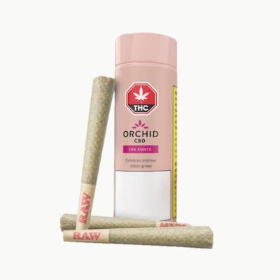 Orchid's CBD Runtz pre-rolls are produced with nothing but hang-dried, slow-cured whole buds which have been consistently ground, and wrapped in premium RAW organic hemp cones. Enjoy five pre-rolls packaged in eco-friendly tin tubes. CBD Runtz is a sativa-hybrid strain. Its lush green, high-quality buds are generously covered in light orange pistils and resinous, surprisingly sticky trichomes. CBD Runtz contains a deliciously sweet, floral aroma and wonderfully diverse terpene profile that is full of myrcene, caryophyllene, limonene and much more.