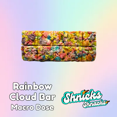 The Rainbow Cloud Bar Macro Dose is a 100mg cereal bar that’s a mix of fruity cereal and melted marshmallow cut into 10mg perforations. It all began here, with a colorful crunch and a burst of fruity flavor that started the Shnicks Shnacks journey. The Shnicks Shnacks team has hand crafted every edible with love to deliver a nostalgic crunch, rich flavor, and a reliable high. It’s your favorite childhood treat, all grown up and capable of getting you very high!