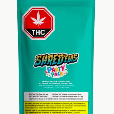 SHRED’ems Shark Attack Party Pack has 10 packs of MAX10 gummies, each with 10mg THC for a total 100MG THC PER PACK! These sativa-dominant gummies unleash a fierce wave of jaw-dropping blue raspberry and green apple flavour.