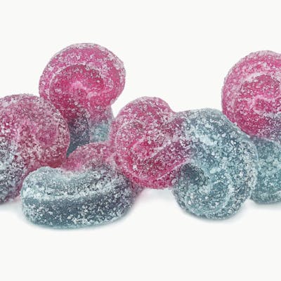 Blue Rasberry Watermelon Indica Sourz by Spinach™ combine raspberry and watermelon. This dual-flavoured gummy with sour crystals comes with 5 big “S” gummies and 10 mg THC total per pack.