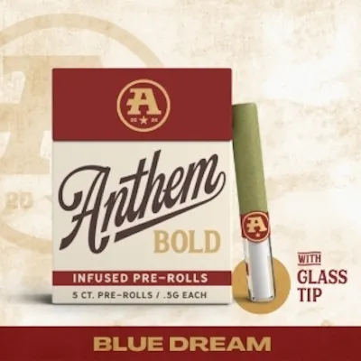 Smooth. Sweet. Elevated — now with even more power. Blue Dream is a balanced hybrid celebrated for its sweet blueberry aroma layered with notes reminiscent of fresh-baked pastry. Bright, slightly creamy, and effortlessly smooth, this cultivar delivers nostalgic flavor backed by Anthem’s bold infused intensity. This 2.5g pack includes five 0.5g infused pre-rolls, each finished with a glass tip for a cooler inhale, cleaner airflow, and a refined, premium feel from first spark to last. Anthem Bold – Glass Tip Series Anthem Bold looks different, feels different, and hits different. Crafted for a higher-potency, elevated experience, the Bold line is built for those who want consistency, flavor, and impact in every session. What makes it Bold: • Infused for amplified potency • Sweet, dessert-forward hybrid profile • Glass tips for smooth airflow and cooler pulls • Even burn across all five pre-rolls Potency Breakdown • THC: 48.60% • THCA: 53.69% • TAC: 49.29% • Total Cannabinoids (TC): 55.99% High potency meets smooth, flavor-forward smoke — delivering both strength and balance. Effects Expect a euphoric cerebral lift paired with gentle body relaxation. Great for daytime creativity, social sessions, or an easy transition into the evening.