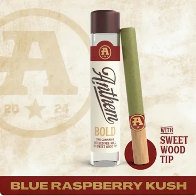 Anthem Bold - Fruit Forward Strain - Blue Raspberry This hybrid delivers a bold burst of sweet, sour, and tart berry flavor with a floral edge. Higher potency for an elevated pre-roll experience with Sweet Wood Tips to enhance the flavor experience.