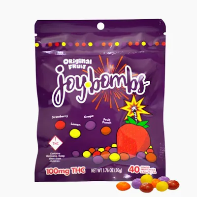 Joy Bombs are the UNGUMMY you’ve been waiting for! These candy-coated fruit chews are precisely dosed with an undetectable 2.5mg of pure THC distillate in each bite-sized piece, so you can micro-dose for days or nom the whole pouch for a 100mg adventure! Perfect for sharing, Joy Bomb’s signature sugary shell means they'll melt in your mind, but not in your car or pocket! -- Each Joy Bombs pouch includes a mix of four fruity flavors! Our Original Fruit flavors include: Strawberry, Lemon, Grape & Fruit Punch.