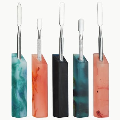 These metal dab tools are made from durable and long-lasting stainless steel and have acrylic handles with various nebulous swirling designs. These tools feature a pointed, flat, and round tips for all scrapping, scooping, and poking needs. Available in two sizes, the tools have lengths of 4.75 inches (12.1cm) and 5.5 inches (14cm).