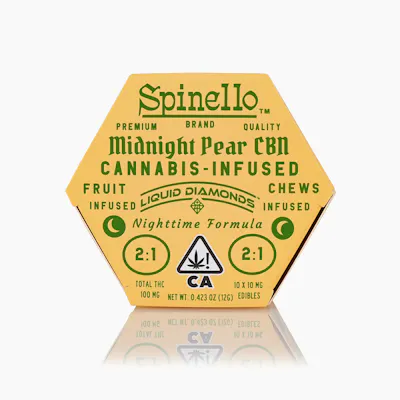 SPINELLO's 100MG Midnight Pear Gummies deliver a perfectly balanced hybrid experience in a delicious edible format. Each gummy offers a smooth blend of relaxation and uplift, making them ideal for any time of day. The Midnight Pear strain brings a sweet, fruity flavor profile with notes of ripe pear and subtle earthy undertones that make every bite enjoyable. With 100mg total THC, these gummies provide consistent effects whether you're seeking creative energy, social vibes, or gentle relaxation. The hybrid classification ensures a well-rounded experience that harmonizes mind and body. Perfect for both seasoned enthusiasts and those exploring edibles, SPINELLO crafts quality cannabis products with flavor and effect in mind. Enjoy the luscious pear taste while experiencing euphoric, happy, and focused sensations that enhance your day or evening.