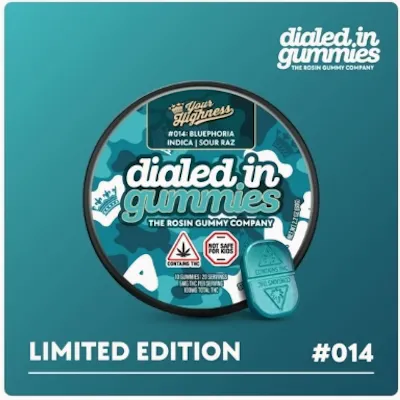 Dialed In Sour Raz x Bluephoria Indica Rosin Gummies are a limited-time offering (LTO) featuring solventless, strain-specific live rosin. Typically sold in 20-packs with a total of 100mg THC (approx. 4.79mg–5mg per gummy), these gummies are crafted in small batches to preserve a full-spectrum terpene profile.