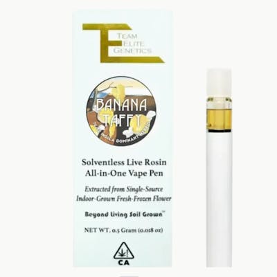 70/30 Sativa Dominant Hybrid All-in-One Vape crafted from a blend of PGB & Banana Taffy premium indoor fresh frozen flower grown in living soil, expertly washed & pressed by Karisma.