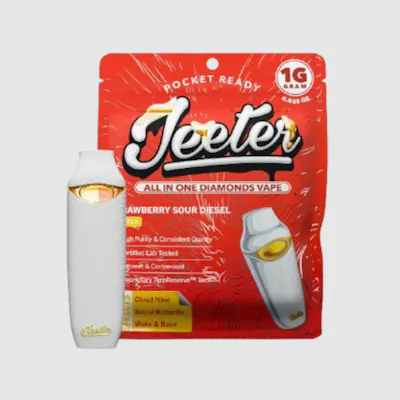 Strawberry Sour Diesel (SSD) - SativaStrawberry Sour Diesel crosses two legacy strains, Sour Diesel and Strawberry Cough, to create a fruity sativa with a serious gas kick. Expect sweet, candied strawberry on the inhale with hints of floral, followed by a sharp exhale of citrusy pine and classic diesel. Bold, flavorful, and perfect for on the go, this one’s got range.Effects: Focused, Energetic, Cloud Nine, Social Butterfly, Wake & BakeJeeter Diamonds AIO Vapes feature our most refined, high-potency extract. We melt crystallized THCA — the purest form of THC—into oil and blend it with strain-specific terpenes for a clean, smooth vapor that hits hard and tastes sharp. The thicker oil requires a tighter wick, ensuring consistent flow and preventing clogs.* Jeeter’s most potent, premium extract* THCA melted into pure oil, paired with curated terpene profiles* Fast-acting, high-clarity effects