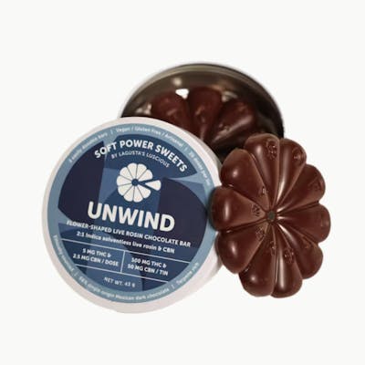 'UNWIND' LIVE ROSIN INDICA + CBN FLOWERS Super creamy almond milk chocolate infused with indica live rosin THC and CBN. Each terpene rich petal contains 5mg of THC and 2.5mg of CBN. 100mg THC and 50mg CBN per package.