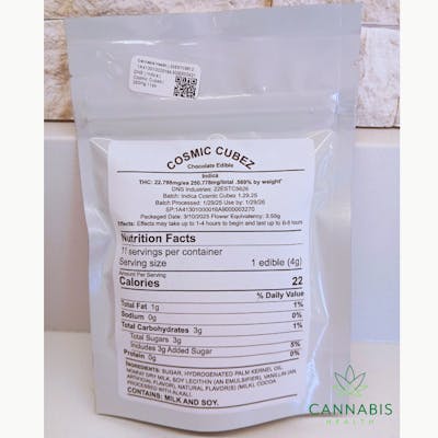 Cosmic Cubez edibles contain cocoa and your finest Live Rosin extracted from DNS flower. Each cube has around 10 mg of THC and may take about 1-4 hours to take effect. The effects may last for around 4-6 hours.