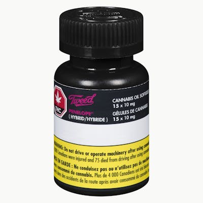 Penelope cannabis softgels are made with CO2 extract from a hybrid strain (grown in a hybrid greenhouse) and are formulated with non-GMO liquid coconut oil, gelatin and glycerine. They have mild THC potency and are available in 15- and 60-capsule bottles.