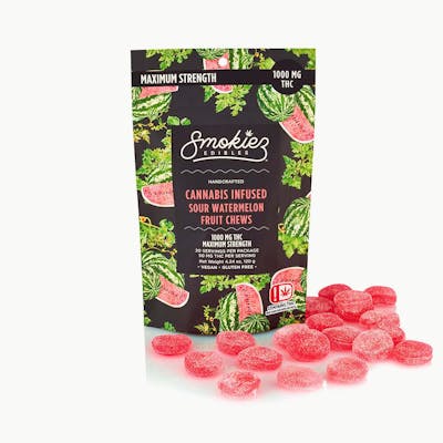 MAXIMUM STRENGTH! Smokiez Sour Watermelon Hybrid Fruit Chews are NOT YOUR AVERAGE FRUIT CHEWS™ ;) These fruit chews taste like a tart and juicy watermelon, with a pleasant balance of fruity and citrusy notes. These delicious fruit chews are a tasty and discreet way for you to medicate! They are also Vegan, Gluten Free, Dairy-Free, and contain NO High Fructose Corn Syrup. Each of our mouth watering fruit chews contain 50 mg of THC, and made with our high clarity cannabis distillate for great taste. There are 20 pieces per package with 1000 mg active THC per package.