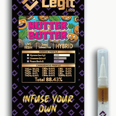 INFUSE YOUR OWN! Introducing "Slick Stick" our Full Spectrum Oil Brush Applicator contains terpene rich dab grade concentrate. Now you can infuse your own joints (inside or outside). Simply brush a light layer of oil to add that extra kick and flavor you've been missing! *Free of botanical terpenes and any other additives! *LIVE RESIN with 15.01% Terpenes! Nutter Butter is a hybrid marijuana strain bred by Humboldt Seed Company from a genetic cross of C-435 x Peanut Budder. This is a soothing strain perfect for low-key activities and for patients who may be dealing with anxiety. Nutter Butter has a mouth-watering profile of earthy, nutty, and gassy notes. It's a low-maintenance strain ideal for both experienced and novice growers, and produces plants with green and purple buds coated in glistening white trichomes.