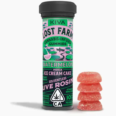 10mg THC per piece | 100mg THC total in 10 pieces Infused with Ice Cream Cake Live Rosin Strain Notes The best-selling indica-dominant Ice Cream Cake strain balances its distinctive vanilla-berry and sugary dough aromas with gassy undertones from its Wedding Cake and Gelato #33 lineage. Made with 100% Live Rosin: Going back to Kiva’s roots, live rosin is a solventless concentrate created with care and craftsmanship. This exceptionally natural extraction process creates a pure expression of the plant, allowing each strain’s unadulterated aromas and terpenes to shine. Flavors Sweet Vanilla Berry Kiva's Lost Farm Gummies are strain-specific, plant-based, and infused with 100% live rosin for a distinctively full-spectrum, true-to-the-plant-high. Each tube contains (10) 10mg THC Gummies. Lineage: Unknown Ingredients: Sugar, Tapioca Syrup, Water, Pectin, Contains 2% or less of: Citric Acid, Sodium Citrate, Cannabis Extract, Sodium Hydrogen Malate, Natural Flavor, Fruit and Vegetable Juice for Color, Spirulina for Color.