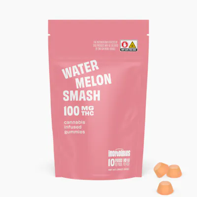 Seedless. Juicy slices of watermelon and a picnic spot that is oh-so-fine. Made with 100% pure cannabis oil in a perfectly blended mixture to ensure accurate dosing and consistency. Perfect for the park and days that end in y. -- Featuring a precision-dosed confection collection with yummy flavors, delicious effects and FDA-approved ingredients, you can trust incredibles to be the credible edible. -- Potential effects: Invigorating, energetic, uplifting -- Serving size: Standard serving is a single gummy (10mg THC). Bag contains ten gummies for a total of 100mg THC. -- Onset & duration: Onset may take up to 2 hours. Duration can last up to 3+ hours. Effects vary by individual. Estimates are based on a standard serving.