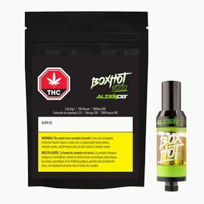 Hybrid Alien OG, a 1.2 g 510-threaded vape, features cannabis distillate. It has gas, earthy, and lime flavours on the inhale, and leaves you with fruity pine on the exhale. Compatible with button-activated 510 batteries. BOXHOT vapes are produced using CO2 extraction and refining processes, and feature an entourage of expertly infused strain-specific terpenes. Extraction : Co2