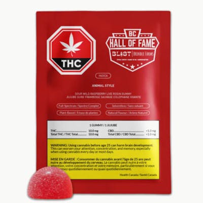 BC HALL OF FAME is an exclusive series by BLAST featuring gummies infused with full-spectrum solventless extracts from top BC micro cultivators. Bred by Swamp Boys Genetics and extracted by Brindle Farms, Animal Style is a potent indica-dominant cross between Animal Cookies and GMO x (Tk x Skunk). The delicious sour wild raspberry flavour enhances this vegan live rosin gummy with a burst of tangy and refreshing raspberry goodness that’s pure bliss for your taste buds.
