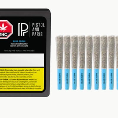 Blue Zushi 10x0.5g pre-rolls are packed with expertly milled whole flower and hand-finished with a Dutch crown. This Zkittlez and Kush Mintz cross delivers bold gassy aromatics with sweet tropical undertones, offering a smooth, full-bodied smoking experience in a convenient multi-pack.