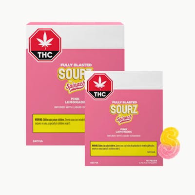SOURZ by Spinach® Fully Blasted Pink Lemonade gummies have 10mg of THC per piece and the flavours of raspberry and lemonade! These dual-flavoured gummies are over-the-top with natural flavours and blasted with sour crystals. Enjoy 10 gummies with 10mg of THC per gummy and 100mg of THC per pack.