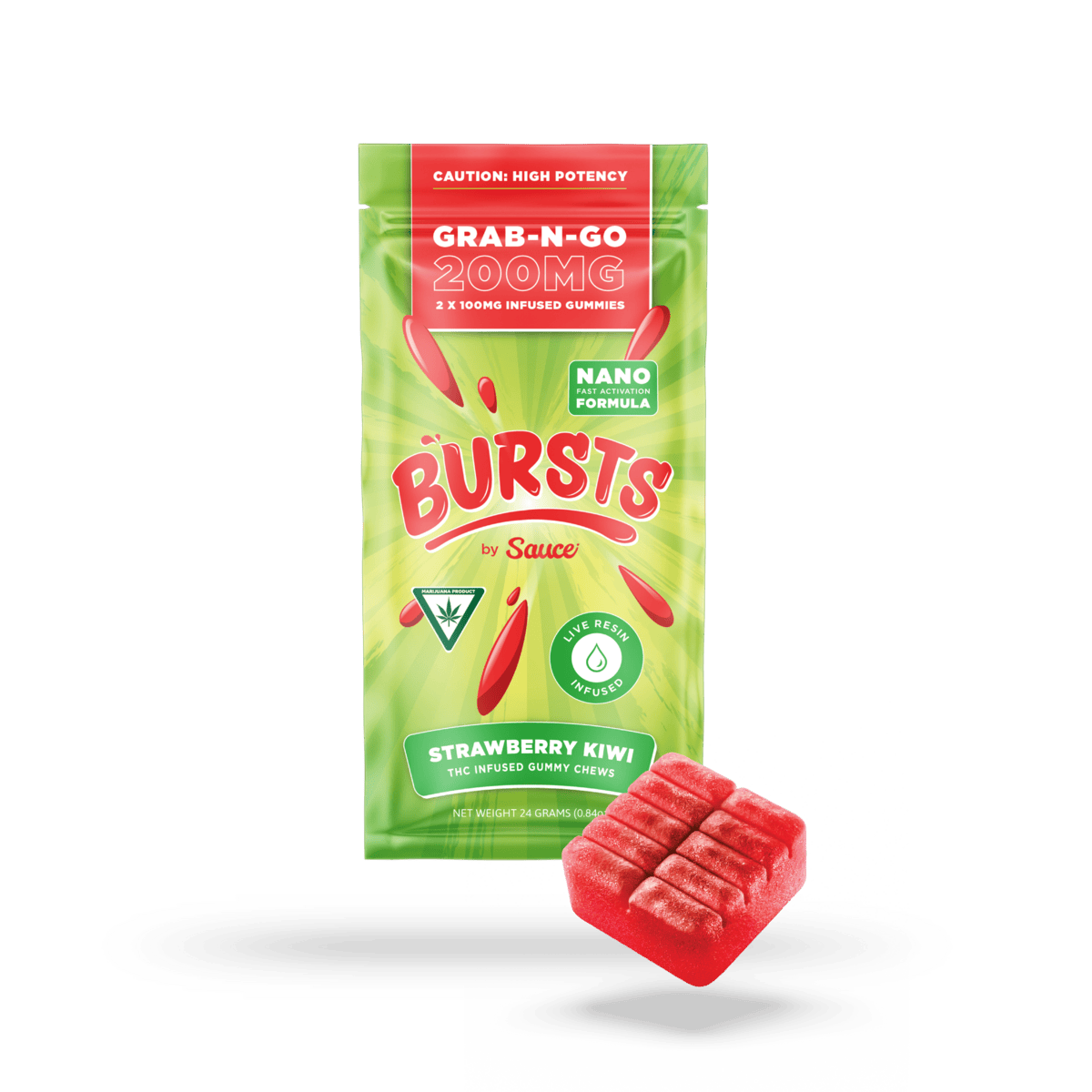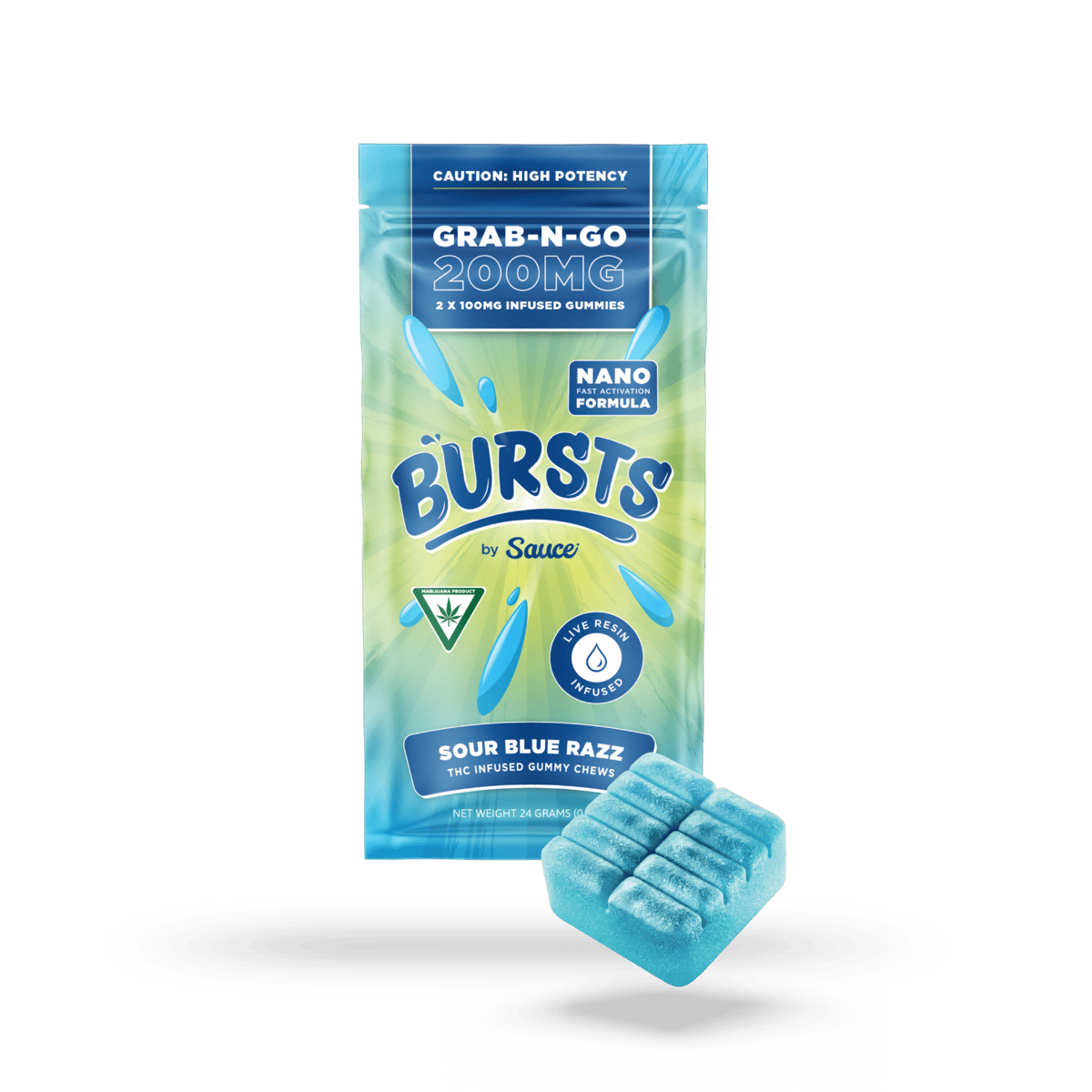 Our gummies are the best in the game! We have perfected the potency, flavor, ingredients, process and activation time. Bursts by Sauce are powered by our 2X Nano Live Resin, which is created using a proprietary process of both encapsulation and sonic energy to break down the molecule size. This makes the gummy hit faster, harder and smoother than any other gummy. Our gummies are also organic, and vegan and gluten free!
