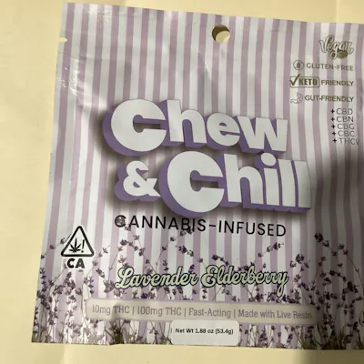 CHEW AND CHILL EDIBLES 100 MG THC GLUTEN FREE CBD CBN CBG CBC THCV GUMMIES CANNABIS INFUSED EDIBLES ELDERBERRY & LAVENDER KETO FRIENDLY10MG DOSES LIVE RESIN FAST ACTING ONLY 9 CALORIES EACH